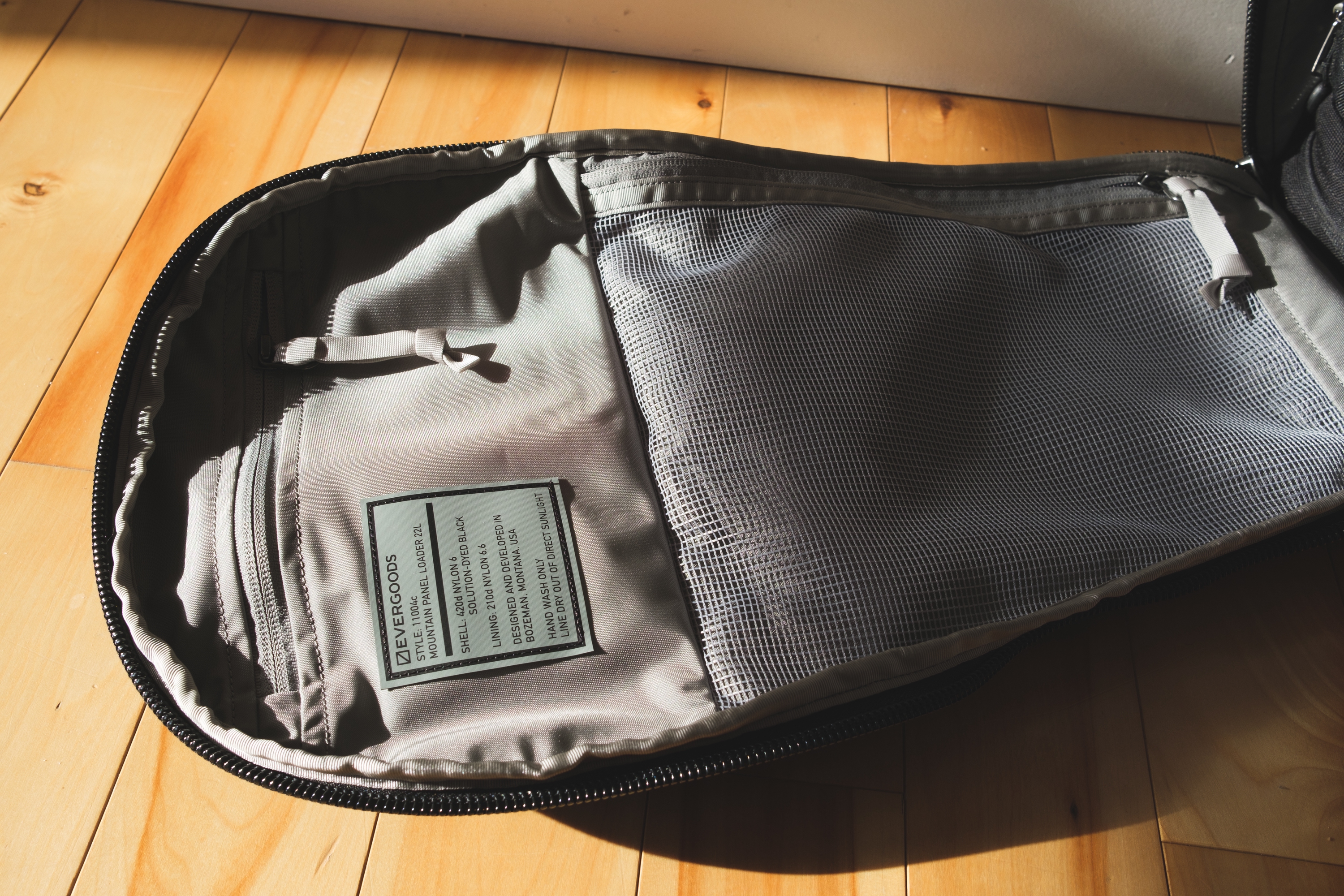 Organization is amazingly well thought out. The upper front stash pocket is perfect for keys wallet and things you want quick access to. The large lower front pocket I typically keep empty and just use to stuff things on my way out the door like hat/gloves in the winter. The main compartment has a U shaped zipper that firstly looks a lot nicer to my eye than the CHZ. The way it arcs seems to make the bag behave very nicely as a half zip if you want it to, it provides a nice stopping point for top access. Unzip all the way for a great clamshell view of the whole pack. Then you’ve got the standard Evergoods pockets inside, one opaque and one mesh.