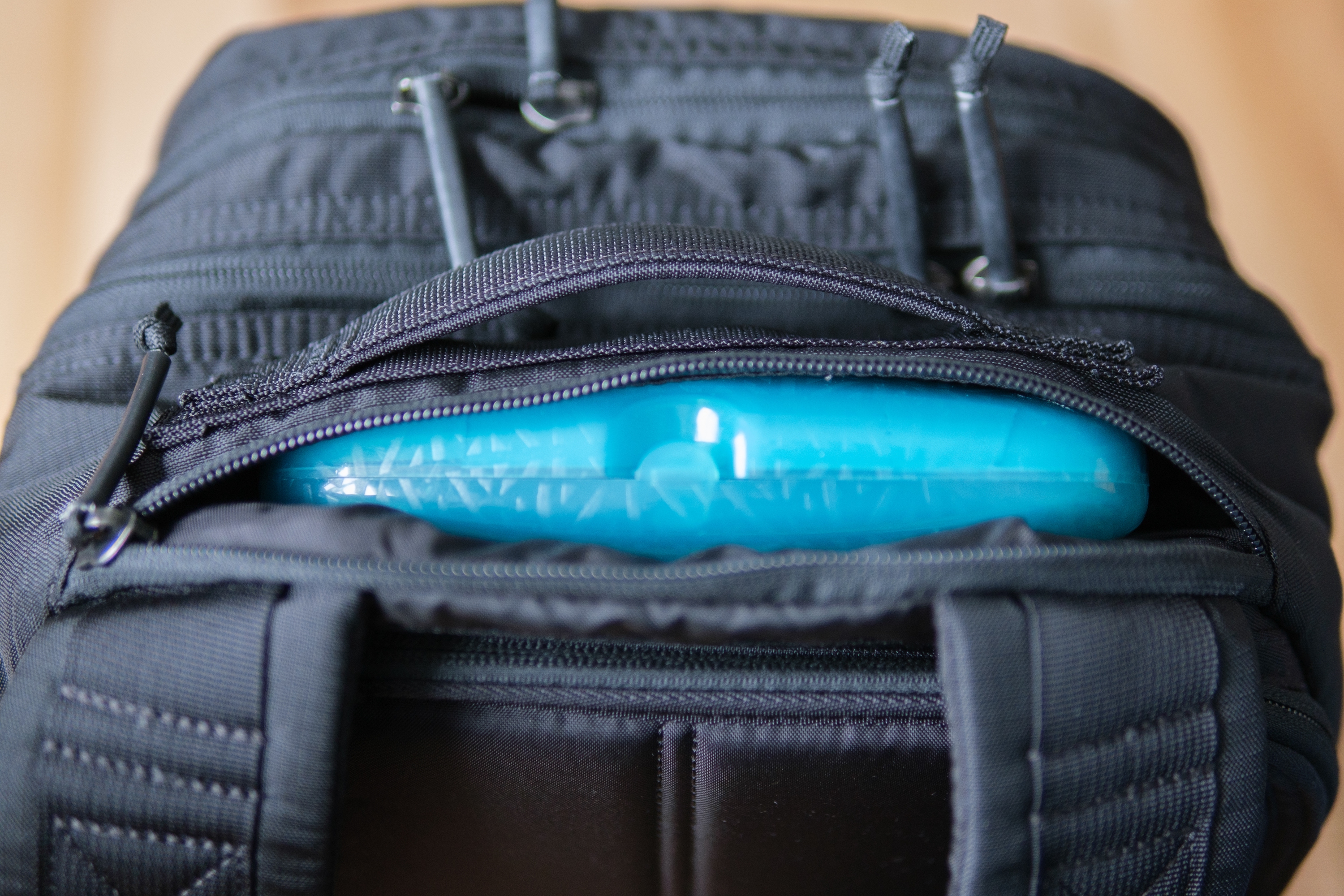On the back of the pack behind the straps is GORUCK’s “bombproof” laptop compartment. To access it you need to flip the right strap over and then can unzip around half the perimeter of the bag. This laptop compartment is a mixed bag, mainly for comfort reasons. For a GORUCK pack to be comfortable, it needs to contour over the top of the shoulders a little bit so you can wear it up high. With this harness system, depending on your laptop size, it’s very easy to end up feeling like you now have a board on your back. You then need to drop the pack lower than it should be worn to relieve pressure on the laptop, and the whole thing just doesn’t feel anywhere near as good anymore. I’ve tried travel with a large 17" laptop in the 26L and I couldn’t do it, had to carry the laptop in the main compartment sleeve, which does fix the problem but then it’s very hard to access. My rule of thumb, this laptop compartment works great for 13" laptops in the 21L, and 15" laptops in the 26L. I think an inch more would be tolerable in both, but beyond that it feels really uncomfortable.